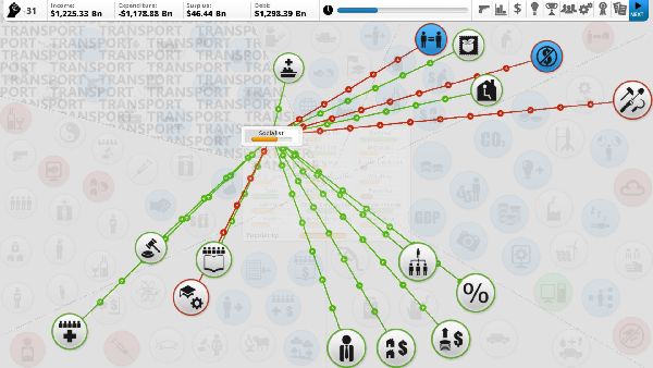 Despite being vastly detailed under-the-hood, Democracy 3 has a unique user interface that makes visualizing the connections between laws, policies, voters and situations easy. A simple iconic-based view of your countries issues allows you to 'drill-down' through all the relationships between policies and voters to quickly analyze the impacts of your decisions. Your trade policy may affect GDP, which will affect unemployment, which will effect poverty, and thus crime, leading to a change in tourism, which affects GDP...