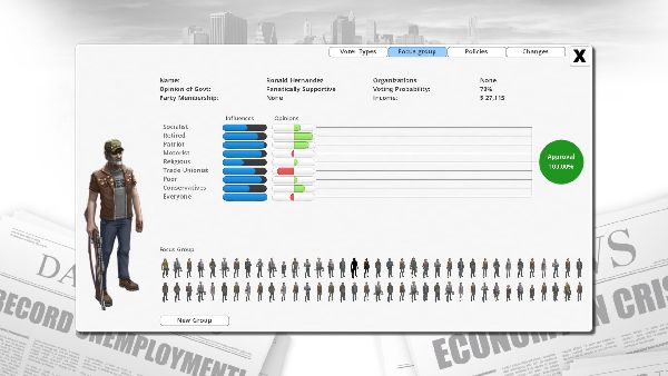 Each individual voter is a mixture of a subset of the 21 different voter groups represented within the game. They might be a young, wealthy, liberal socialist commuter, or a retired conservative religious capitalist, for example. Not only this, but the extent to which they identify each of those groups is both variable, and can be affected by your policies in the long term. Convert your country to religion, or atheism, to capitalism, or socialism by careful and nuanced adjustment of your policies and laws over time. A 'focus group' feature lets you look at individual voters and see exactly how they came to a decision to vote for you (or not!).