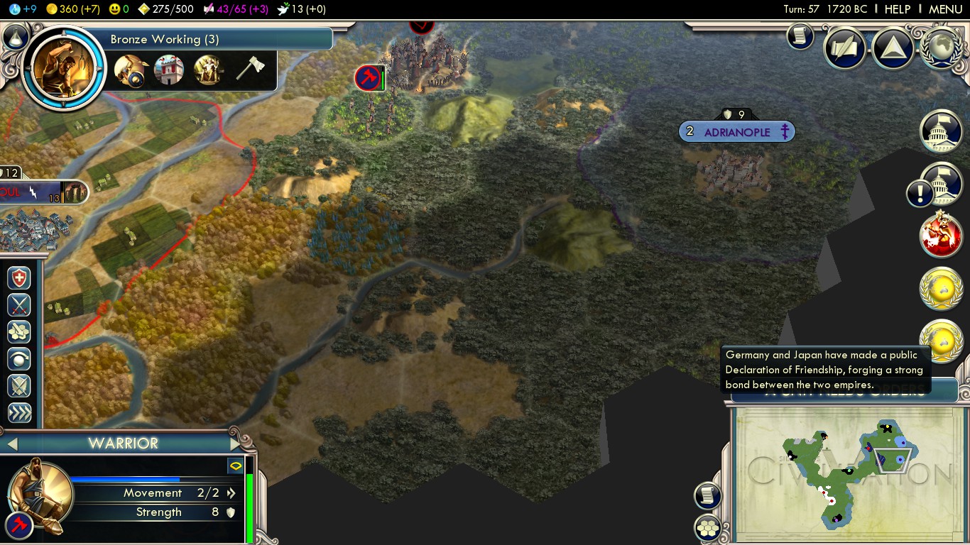 International Trade Routes: Build your cities into hubs of international trade by land and sea, creating great wealth and prosperity for your people, while also spreading religion, cultural influence, and science. The number of trade routes increases through the advancement of economics and technologies, the creation of wonders, and the unique abilities of your civilization. Will you connect to a closer city for a lower payoff and a safer route, choose a longer route with more risk for the bigger payoff, or perhaps point your trade route inward, sending vitally important food and production to the far corners of your own empire?