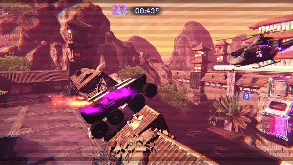 Not all of Trials of the Blood Dragon’s new ideas flounder, however. Later stages swap the guns for a grappling hook. You have to manage momentum and positioning with greater care than usual, but it leads to some tense, heart-pounding moments when speed is a factor--there's an amazing boss fight against Power Ranger lookalikes that makes rather brilliant use of the hook. Roxanne eventually gets to use a radio controlled car built for speed and wild loop-de-loops in a distinct slate of Hot Wheels-inspired courses, adding another appreciable layer of over-the-top action.